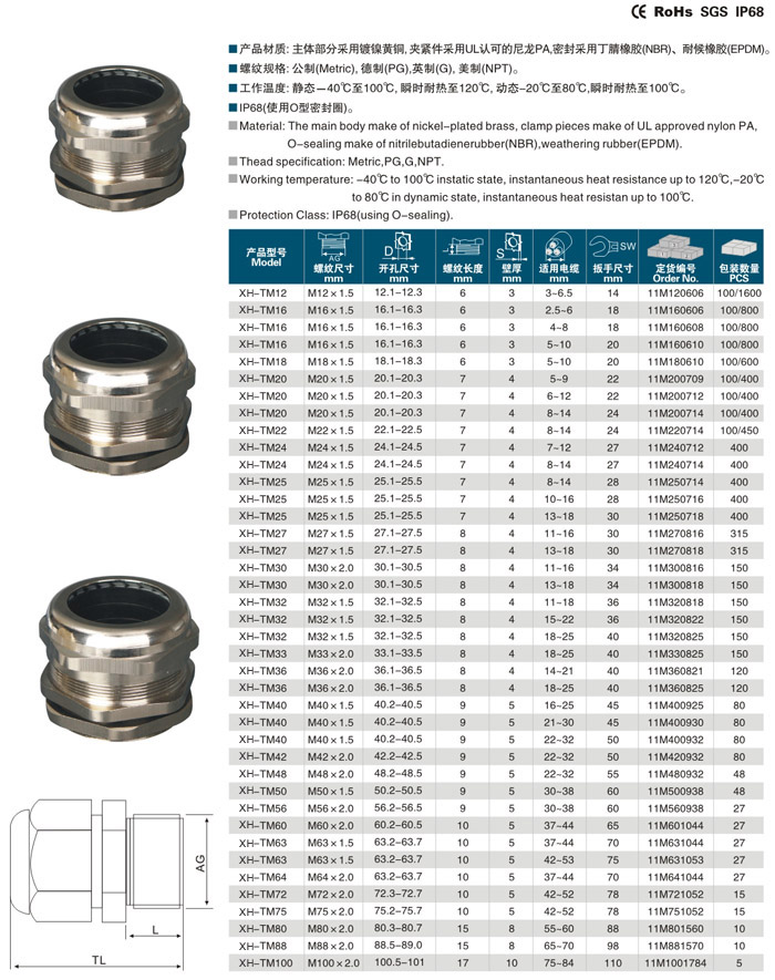 產品材質:主體部分采用鍍鎳黃銅,夾緊件采用UL認可的尼龍PA,密封采用丁腈橡膠(NBR)、耐候橡膠(EPDM)